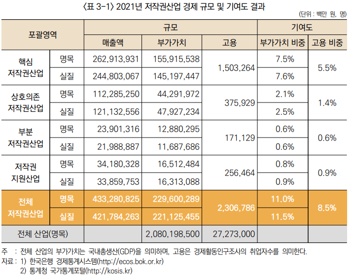 출처 : 한국저작권위원회, "한국 저작권산업의 경제기여도 조사", 저작권관계자료 2023-02, 2023.12. 26면.